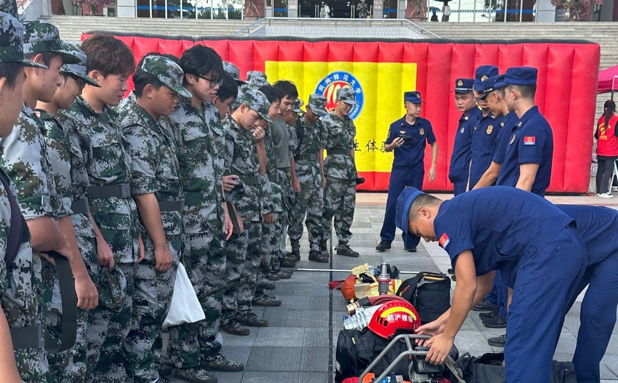 同时,为推动安全理论向实践能力转化,在逸夫图书馆前打造了“消防安全实践区”,以“实战化演练+系统化教学+沉浸式体验”相结合的方式,设置现场教学、消防器材展示、火灾模拟逃生体验屋三大板块,形成“理论讲解—实物认知—实操体验”的完整学习链条。