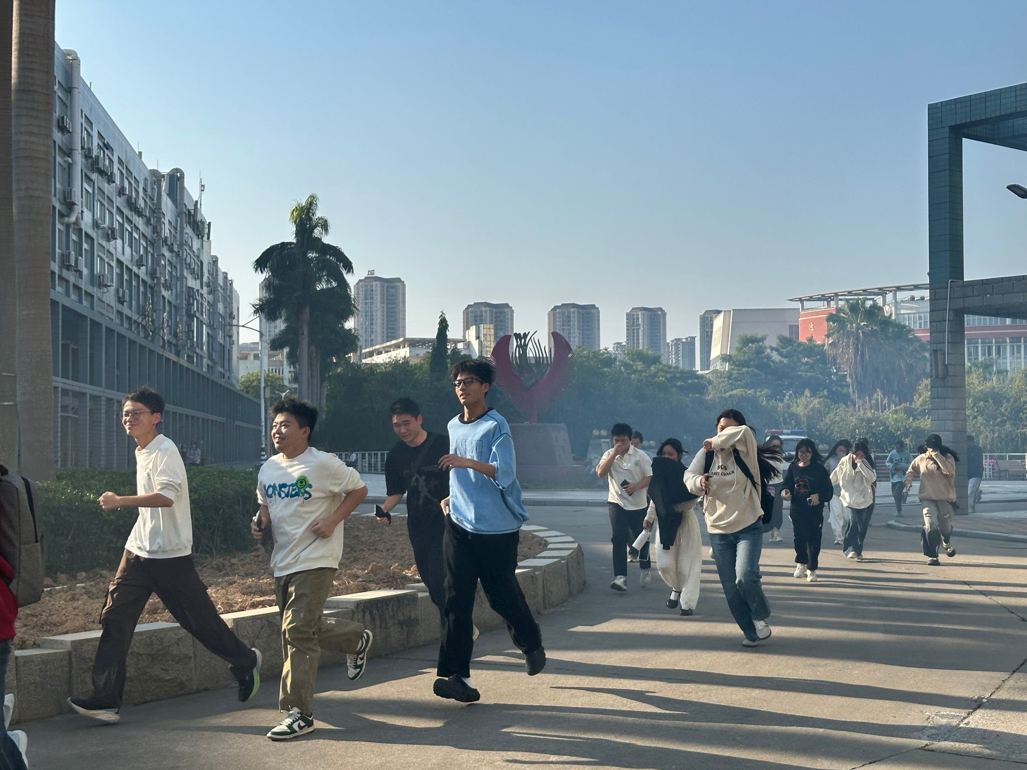 下午3点,随着警报声响起,演练正式拉开帷幕。各工作人员引导师生用湿毛巾捂住口鼻,弯腰低姿,沿预定疏散路线快速、有序撤离至楼外指定安全集合点,整个过程紧张而有序。